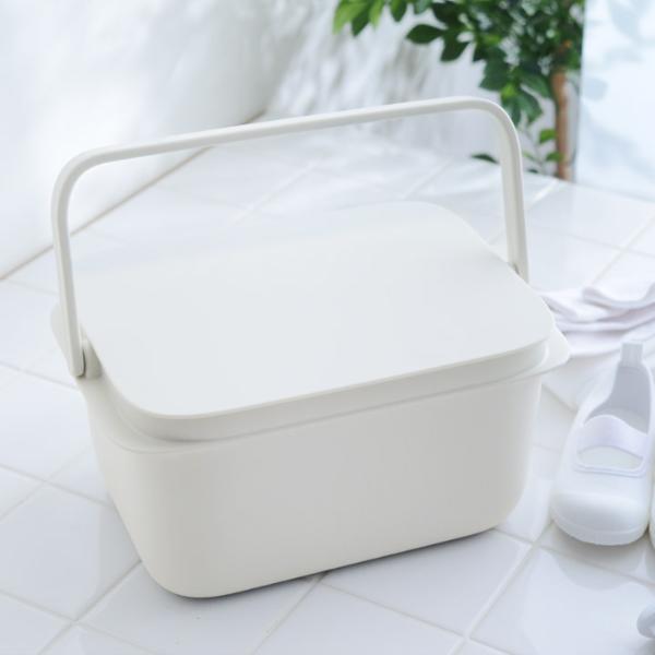 洗面台に収まるコンパクトサイズのフタつきバケツ。上履き、スニーカーもつけ置き洗いしやすいスクエア型。マスクのお洗濯にも◎です。