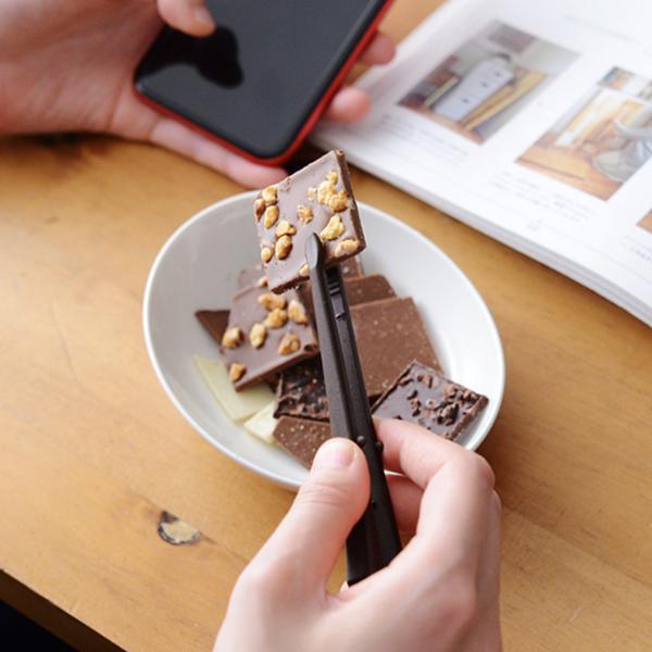 スナックなどのお菓子を手を汚さずに食べられる、おやつ用の小さなトング。直接触れないので衛生的に間食を楽しめます。外出先でも使えるケース付き。