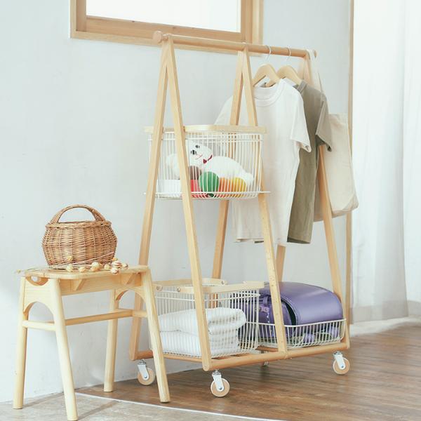 通園通学グッズがひとまとめにできる、北欧ライクな雰囲気のカゴ付きハンガーラック。朝の支度やリビング学習もスムーズに。