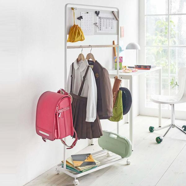 通学に必要なものを揃えて収納できるハンガーラック。パネル部分はマグネットで時間割りやプリントを貼りつけられます。