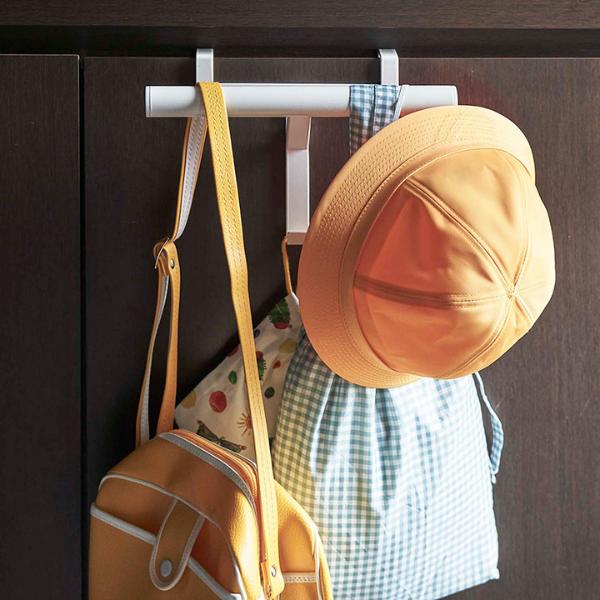 下駄箱扉に差し込むだけで、玄関の下駄箱収納扉に簡単に取り付けられる便利なハンガー。しっかり掛けられる丈夫な仕様です。