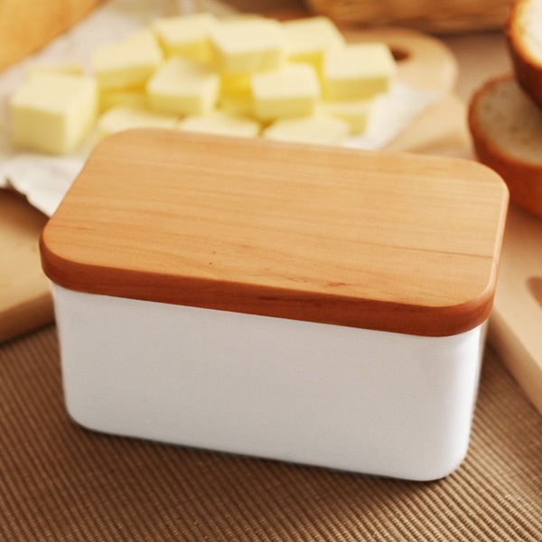 昭和9年の創業以来、琺瑯を作り続けるメーカー「野田琺瑯」。サクラの天然木のフタがアクセントになった、ナチュラルでシンプルなバターケース 450g用が届きました。ニオイ移りがなく、冷却性の高い琺瑯は、バターとの相性も◎。フタは、バターを切るときの、カッティングボードにも使えます。