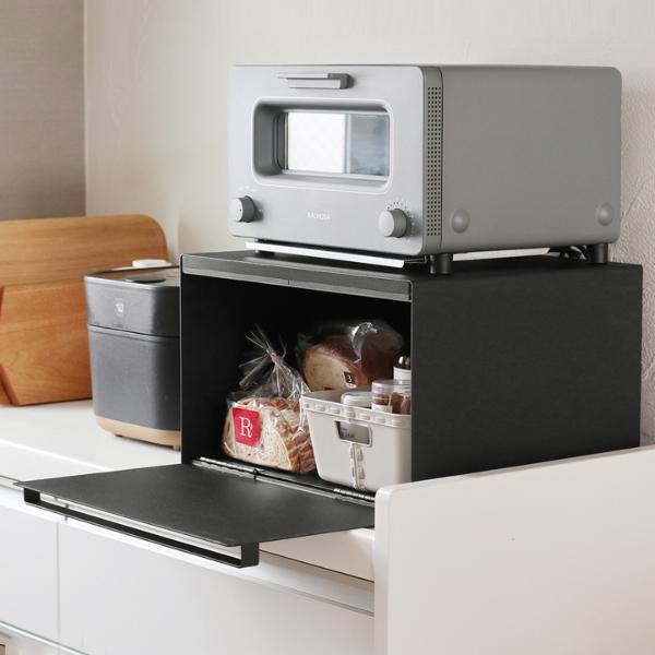 キッチンカウンターなどで雑然としがちなパンやお菓子、調味料などを目隠ししながら美しく収納でき、上にはトースターなどを置くこともできる大容量ブレッドケースです。