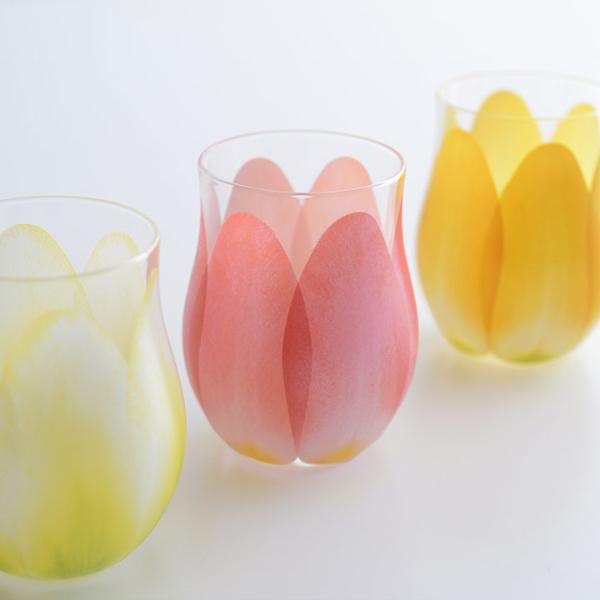 かわいらしいチューリップが転写されたグラス。本物のような見た目は食卓を楽しく賑やかに演出してくれます。こだわりの形状で、ワインや日本酒の香りを楽しむのにも◎