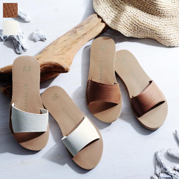エコバッグ片手にショッピングする休日にぴったりな、ビーチサンダル感覚のラクチンさ。キャラメルのような型押しが上品なアクセントになり、ベルトのわずかなカーブが女性らしく魅せるポイントになっています。