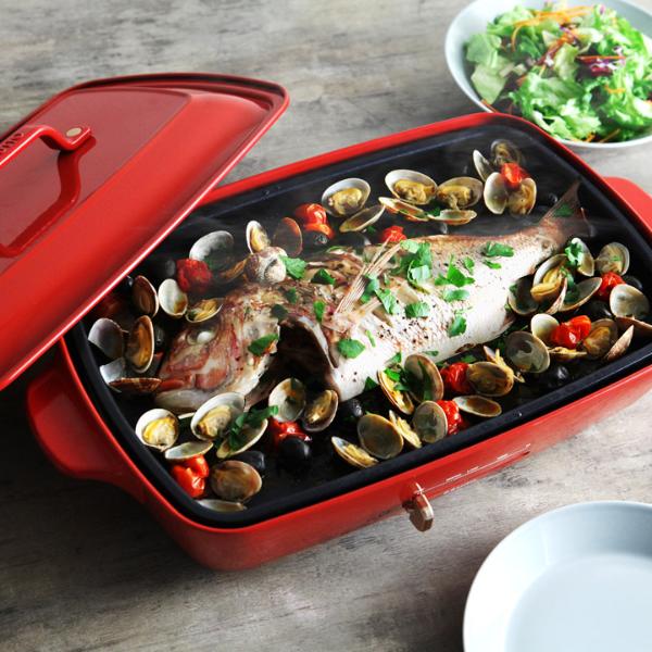 オーブンや直火はもちろん、魚焼きグリルにも入る薄型グリラー。蓋をすれば全体から食材にじっくりと熱が伝わり、おいしい蒸し焼き料理が作れます。