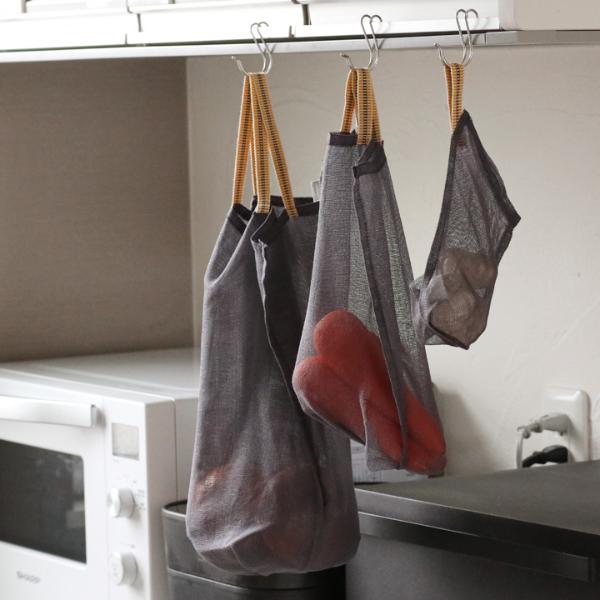 そんな大事な風通しをばっちり確保する通気性抜群な蚊帳素材を使い、吊るせるバッグ型にした野菜収納袋がこちらです。