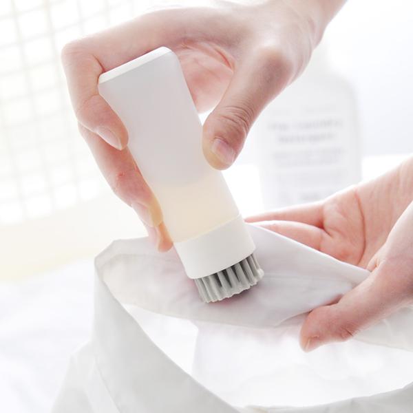 襟、袖などの部分汚れの、お洗濯前の予洗いに。容器の底面をプッシュすると洗剤が出て、狙った汚れを片手でササッと洗えるコンパクトなブラシです。