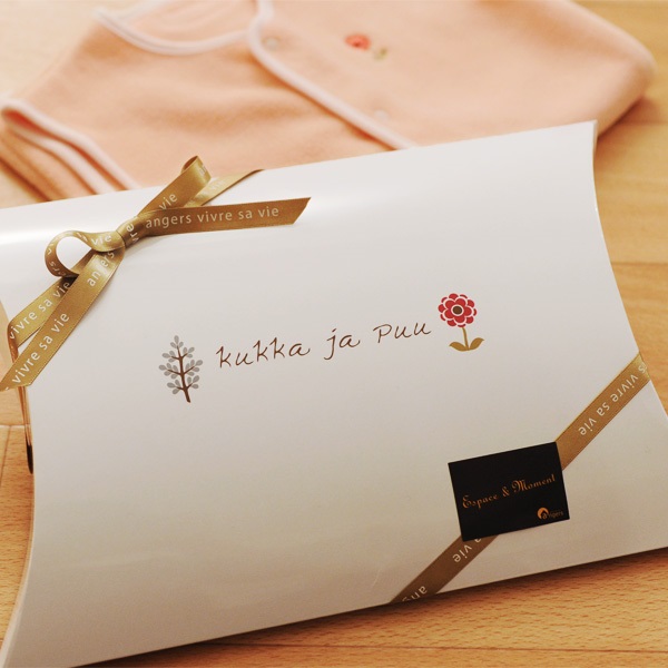 ご出産のお祝いや甥っ子や姪っ子ちゃんへのプレゼントととして人気のアイテムである、kukka ja puu スリーパー/ラッシュガード用 ギフトBOXです。ブランド名とその意味を持つ木と花のイラストがアクセント。贈る人も贈られる人もうれしくなるようなキュートさです。