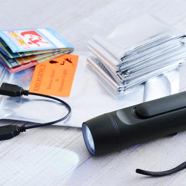 【ご紹介したアイテム】 付属のUSBケーブルでの蓄電はもちろん、手回しでも蓄電できるダイナモライト。保温性のあるアルミレスキューシートとセットになった、見せ置きできる防災グッズです。