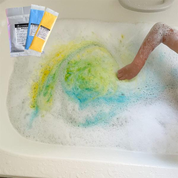 子どもが大好きな泡風呂に、カラーパウダーで色を着けられる入浴剤。2色入りなので、色の変化を楽しんだり、模様を描いて遊べます。