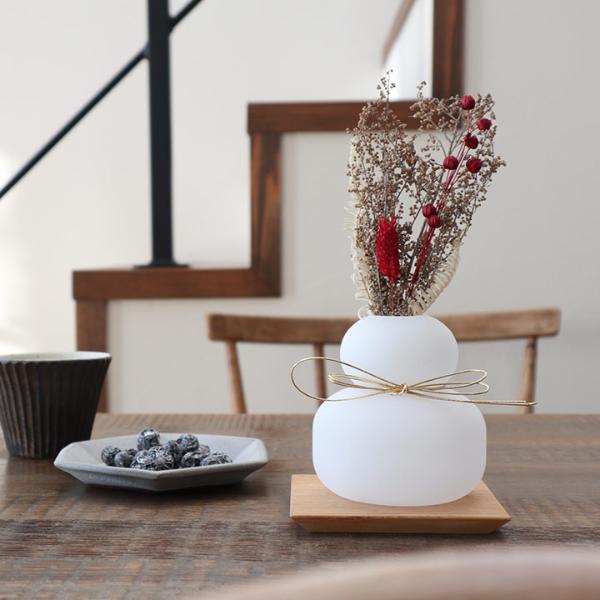 お正月らしい雰囲気のドライフラワーが入っているのは、鏡餅の形をしたフラワーベース。水引は取り外せるので、お正月が過ぎてもフラワーベースやオブジェとして年中飾れます。