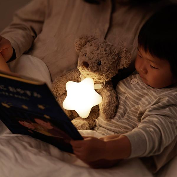 寝る前に絵本を読み聞かせの時間を優しく照らしてくれる絵本のためのLEDライト。可愛らしい星形で、ぬいぐるみにも取り付けることができます。