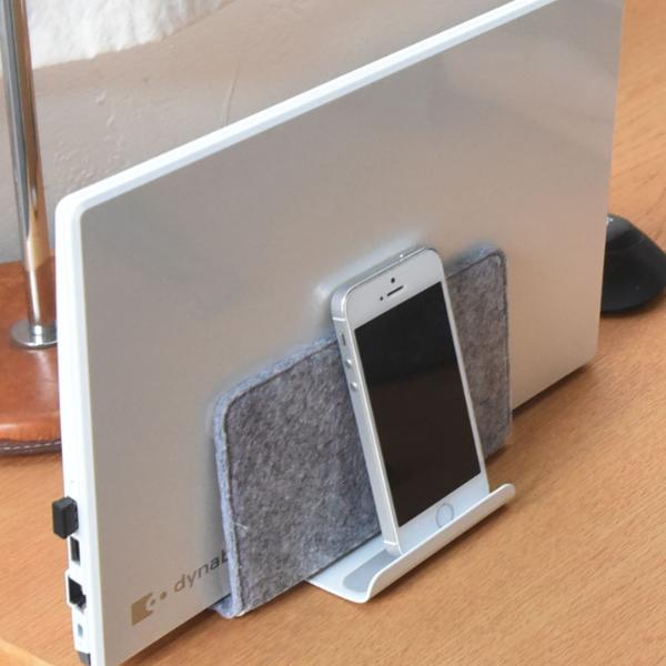 フェルト素材なので、PCが傷つく心配がないのと、会社用携帯は必ずここで充電するので、スマホを同時に立てかけられるのも気に入ったポイントでした。
