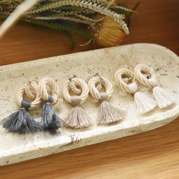 耳元に1つ加えるだけで、ぐんと印象的に見せてくれるラタンとタッセルのデザイン。ラタンのリングは取り外せて、シンプルなビーズのフープピアス(イヤリング)としても使えます。