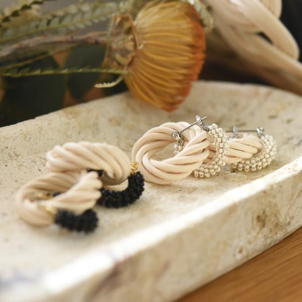 耳元に1つ加えるだけで、ぐんと印象的に見せてくれるラタンのデザイン。ラタンのリングは取り外せて、シンプルなビーズのフープピアス(イヤリング)としても使えます。