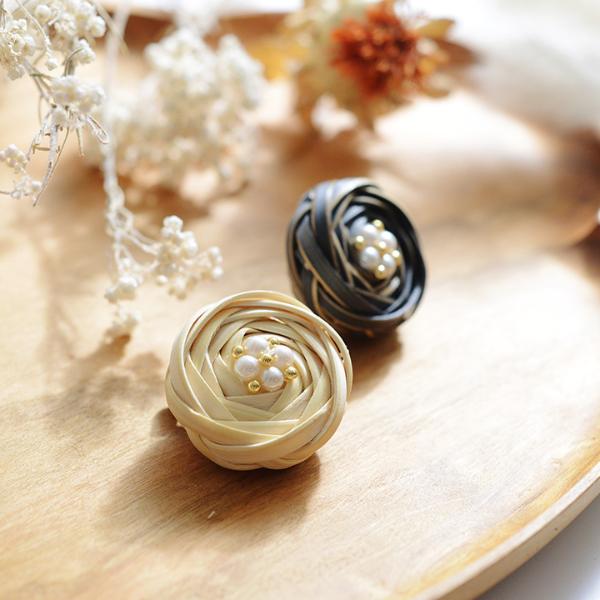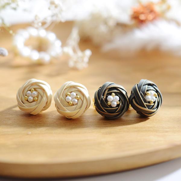 MSNOM(ムスノム)の「お花結びシリーズ」は、フォーマルシーンには珍しいラタン素材を使ったひと品。編み込んだ中央部分にビースをあしらい、カジュアルなイメージのラタンを綺麗めに仕上げた、ブローチとイヤリング/ピアスです。