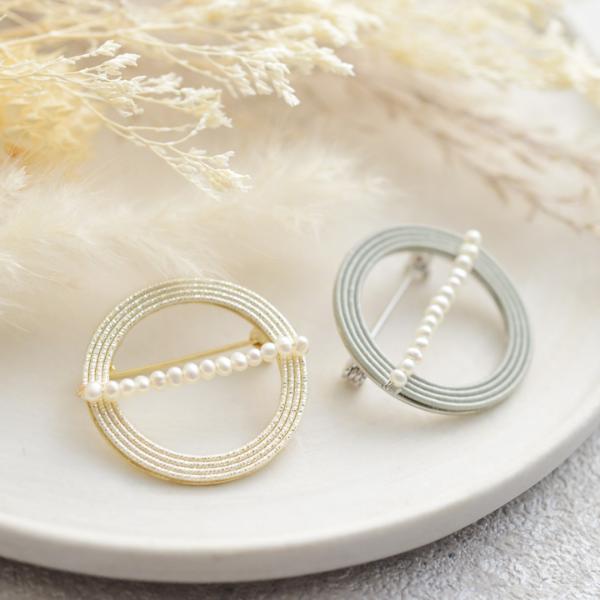 こちらはサークル状の水引と直線の淡水パールを組み合わせたブローチ。凛とした雰囲気のあるデザインが魅力です。