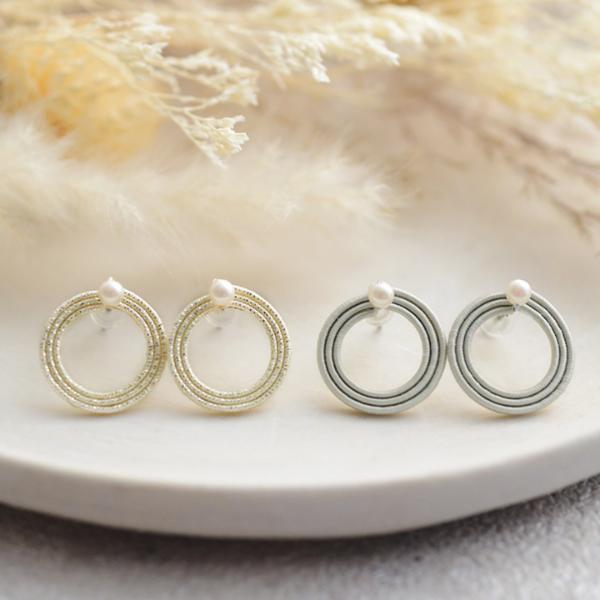 こちらはサークル状の水引と一粒の淡水パールを組み合わせたピアス。個性があるのにシンプルで合わせやすいデザイン。