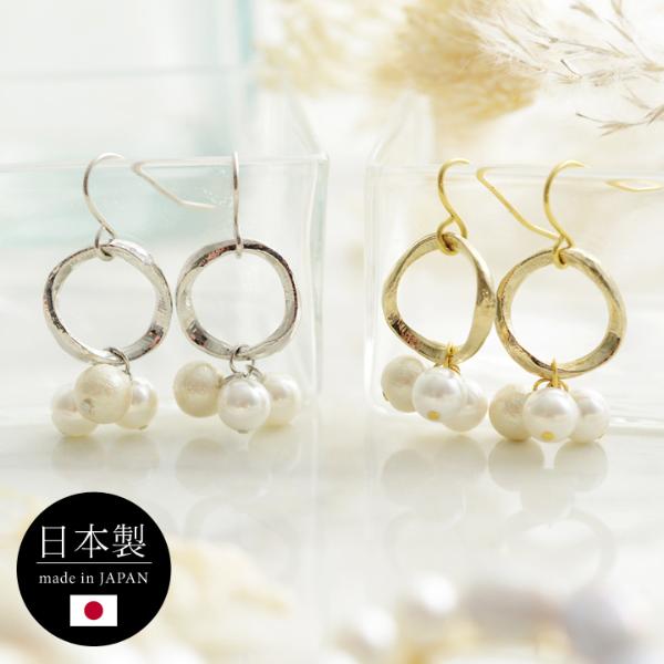 こちらは、不揃いなサークルにシェルパールとコットンパールをあしらったデザインのピアス&イヤリング。動くたびに揺れて輝き、心も弾むようなデザインです。