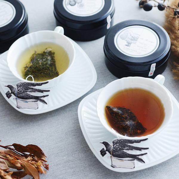 フランス・リヨン発。世界各国から厳選した茶葉をベースに、天然由来のフルーツエッセンスやスパイス、美しい花々をブレンド。伝書鳩のタグが付いたティーバッグ入りギフト缶です。