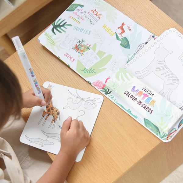 移動時間や待ち時間など、子どもの退屈しのぎにピッタリな水塗り絵です。準備するのは水だけでOK、外出先でも手軽に遊ぶことができます。