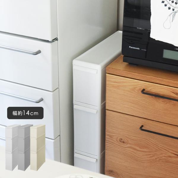 スキマに収まる幅約14cmのストッカー。奥行きはたっぷりあるので、スリムでも収納力◎。洗濯機横や洗面台横、トイレや冷蔵庫横のスペースにも。