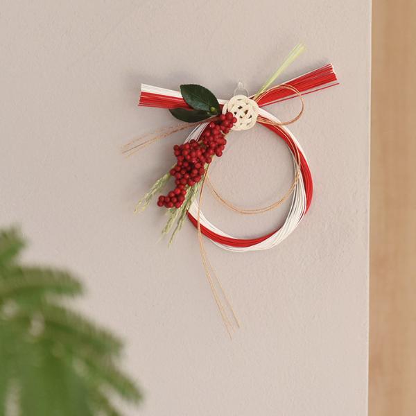 続いては、しめ縄ではなく、伝統ある「水引」を用いてすっきりとした印象のしめ飾り。クリスマスリースのように手軽に季節感をプラスできる、”和風すぎない”お正月リースです。