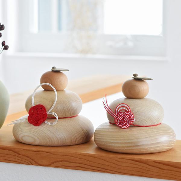 丸太から切り出した、自然な状態の無垢材のセン材を使用した鏡餅。木目の美しさと滑らかで温かみのあるナチュラルな質感が、日本のお正月らしさと家具なじみの良さを叶えます。