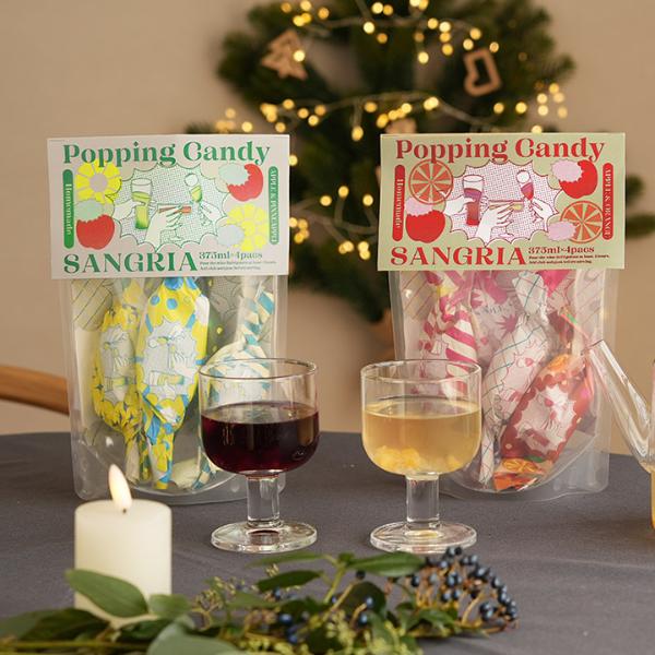 お口の中でパチパチ弾ける食感を楽しめるポッピングシュガー付きのサングリアキット。ワインを注ぐだけで簡単に自家製サングリアが完成です。