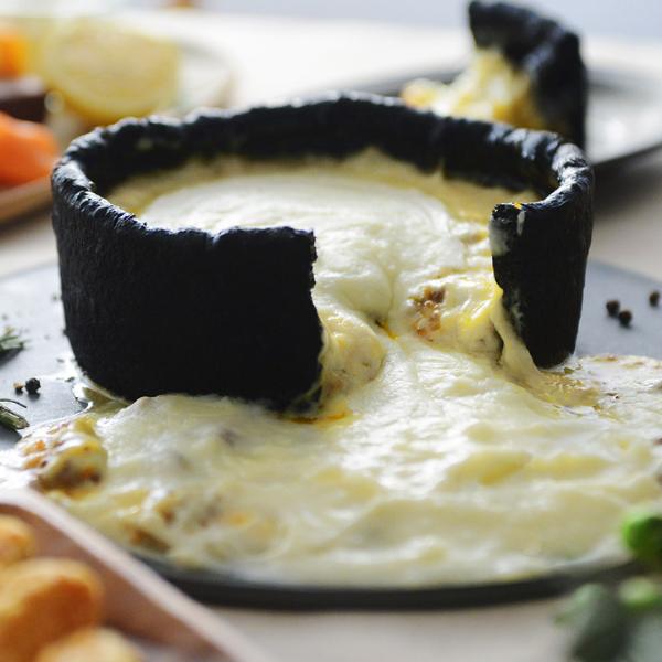 Dining Bar UNTITLEDのシカゴピザは、竹炭パウダーを練り込んだ真っ黒な生地に、チーズを煮込んだ白いソースが特徴。ピザを持ち上げるとチーズが溢れ出します。