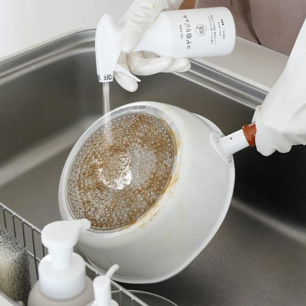 コンロや鍋、やかんの頑固なコゲ付きにはこちらのコゲ取り洗浄剤。ワンプッシュで汚れにピタッと密着。少し時間をおくと、じわじわ汚れが浮いてきて流すだけでスッキリ。