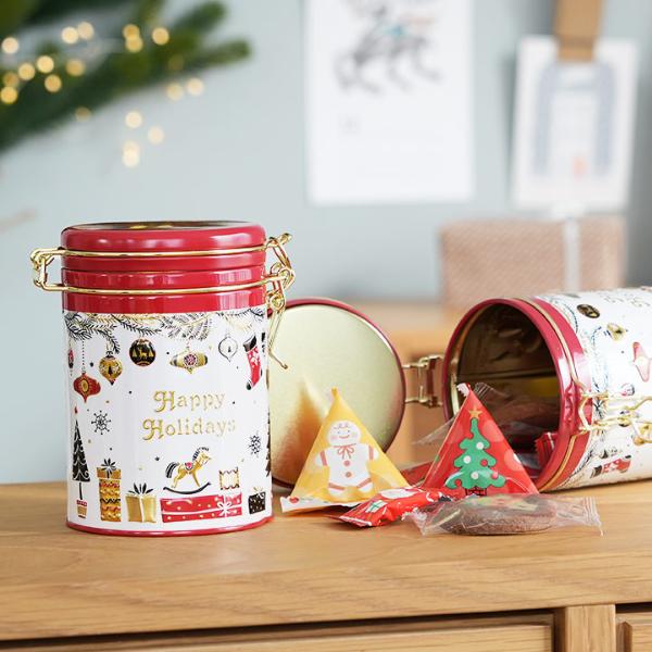 クリスマスモチーフがエンボス加工で散りばめられたキャニスター缶。レッドやゴールドなど高級感のある彩りは、華やかなクリスマスを演出。3種類のお菓子入り。