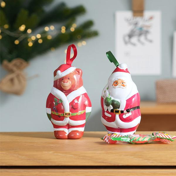 コロンとしたサンタさんとクマさんの缶入りお菓子。上の紐で吊るせるので、ツリーやタペストリーに飾るオーナメントとして使えます。