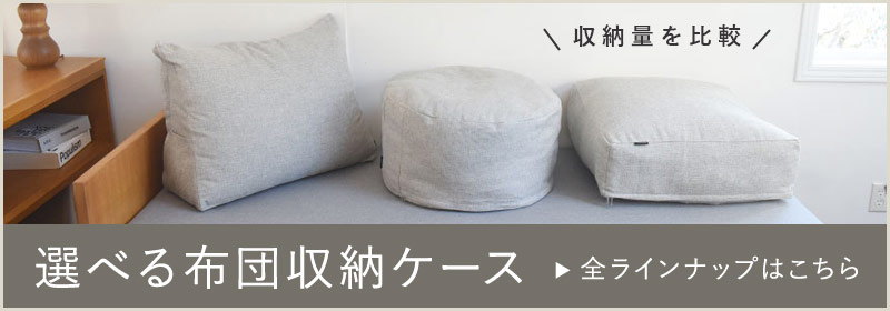 かさばる布団をたたんでまるめて入れるだけ!クッションに早変わり。マルチ使いできるキューブ型と、枕のように使えるロング型です。