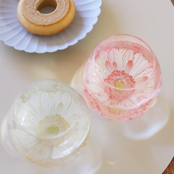 ゆらゆらと揺れるぽってりとしたフォルムに、ガーベラの花が描かれたこちらのグラス。透明な飲み物を入れると、水面にふわりと花びらが浮かぶように見えるのが特徴。食洗機で使えるのもポイント。