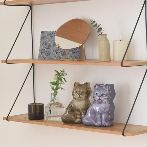 ちょっと困った表情が愛らしい表情の猫は、スコティッシュフォールド。ブラウンとグレーの毛色、2種類からお選びいただけます。タテ約15.3cmとやや小ぶりなサイズのリアルなイラストの缶は、食べ終わった後も置物として◎。