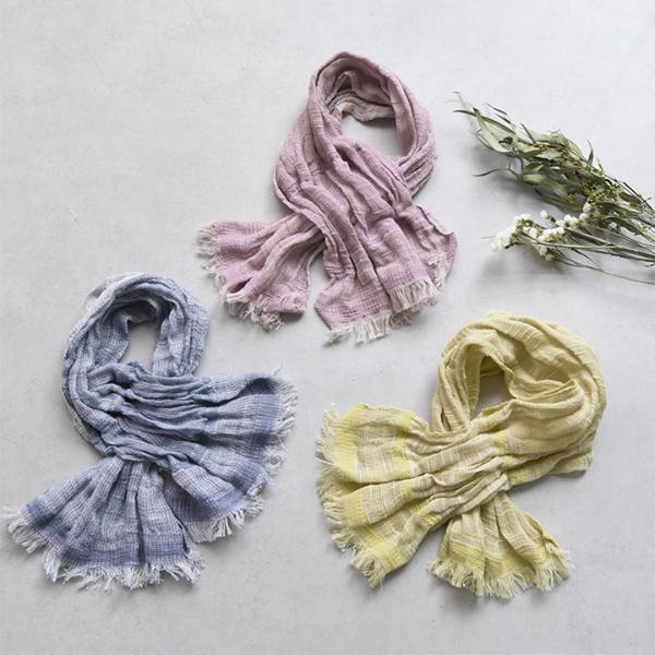 愛媛県今治の山間で作られ、職人のこだわりが詰まった工房織座のストール。軽やかな透け感とリネン混によるほんの少しのハリ感が、春夏の装いにぴったり。カーネーションとパンジーの天然の染め色が優しい雰囲気です。