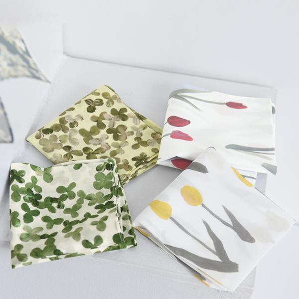 綿100%、薄手の平織り生地で作られた正方形のハンカチ。約52×52㎝と少し大きめのサイズだから生活スタイルに合わせて、1枚で色々な使い方ができるのも魅力です。