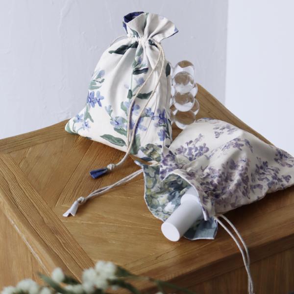 表も裏も、どちらの面でもお使いいただけるリバーシブル生地を使った巾着型のポーチ。コスメ類の持ち運びや貴重品入れなどいろんな用途にお使いいただけます。