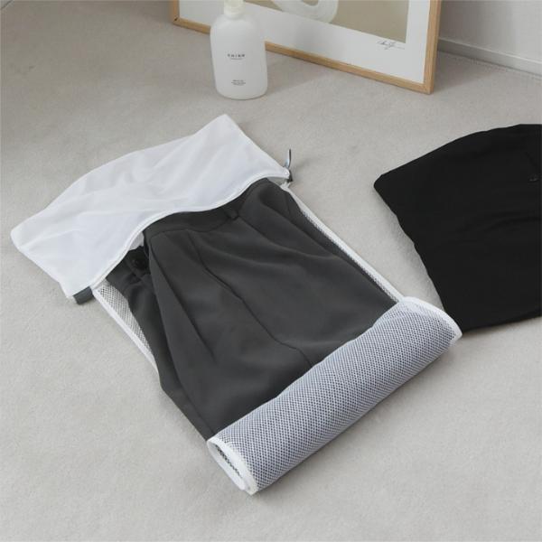 通勤用パンツやワンピース、自宅で洗濯するとシワシワになる、丈の長い衣類をまるっと洗濯できる、パンツ用洗濯ネット。衣類を傷めず、アイロン掛けの時短にもなるアイテムです。