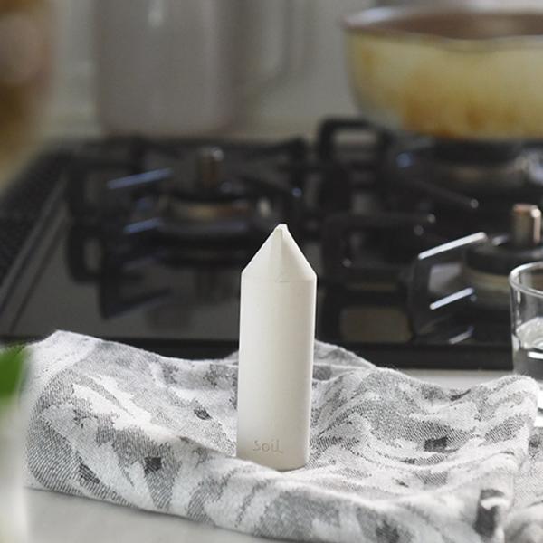 珪藻土にクエン酸を配合した自然派素材の新しいお掃除道具。先1cmほどを水に濡らして、焦げつき部分を擦るだけの手軽さです。