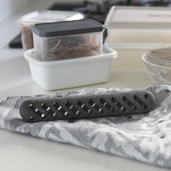 珪藻土、リサイクルアッシュ、大粒炭を特殊配合した冷蔵庫内の脱臭してくれるアイテム。このスリムな形状は、庫内のデッドスペースにすっと収まります。