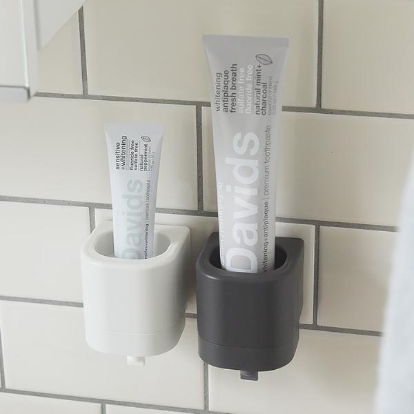 洗面台にあると便利な「歯磨き粉用」ディスペンサー。こちらは、マグネットではなくシールタイプのフックでの設置です。