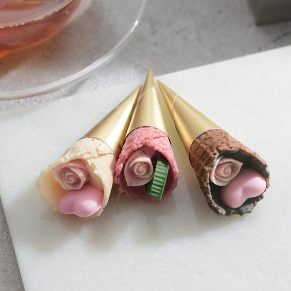 一口サイズの可愛い花束ショコラは、口に入れると繊細な食感と滑らかな口溶け。コーンの中には濃厚なガナッシュチョコレートが入っており、見た目の可愛さだけでなく、本格的な美味しさも楽しめます。