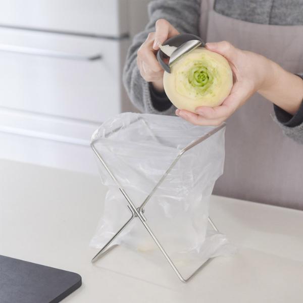 ポリ袋を大きく開いてセットできるので、ポリ袋の上で野菜の皮や卵の殻をむいてもしっかりキャッチしてくれます。