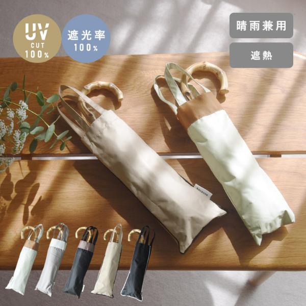 バンブーの持ち手の折り畳み日傘に、グログランの配色がアクセントになった、目を引く華やかさです。ホワイト×赤みライトブラウン、ライトグレー×アイボリー、ブラック×ピンクブラウンの全3色展開です。