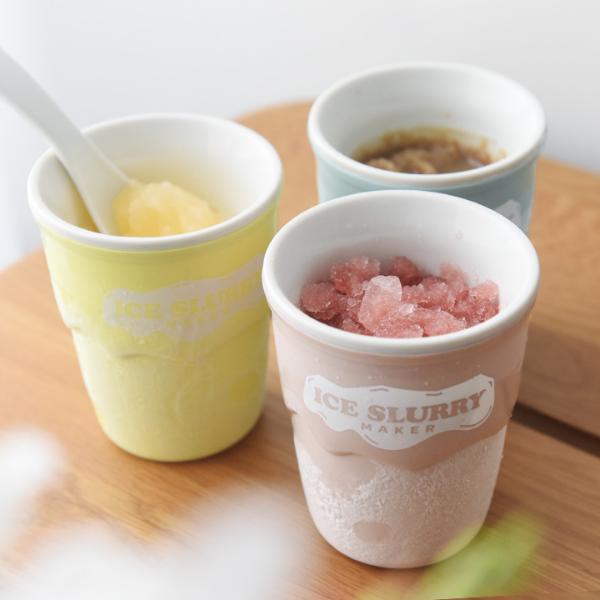 冷凍庫で10時間以上冷やしたカップに、お好みのドリンクを入れてくるくる混ぜるだけで、シャーベット状のドリンクができあがるアイススラリーメーカーです。スポーツドリンクで作って熱中症対策にも。