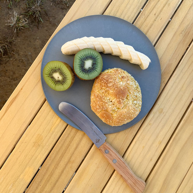 こちらの写真は、とあるキャンプ時の朝食です。キャンプ場で購入できる手作りパンとフルーツがこの日のメニューでした。アンジェ...