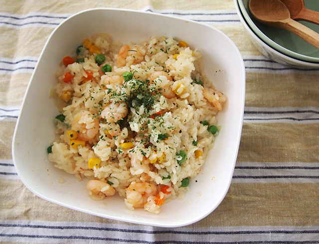 「クッキングディッシュ」を使った時短レシピ。前回のカレーピラフレシピに続き、本日はピラフの王道ともいえる「エビピラフ」レ...